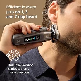 Efficient in every pass, even on a 7-day beard: designed to cut hair in any direction thanks to the 360 rotating Dual SteelPrecision blades with 7 million cutting motions per minute
