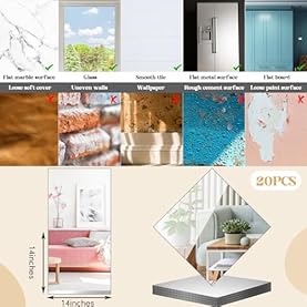 Warm Reminder: the attached stickers are highly sticky and are not suitable for brick walls, mottled paint surfaces, loose wallpaper, soft leather surfaces, and rough cement surfaces; The advantage of these acrylic mirrors is that they are not easily broken, but the long distance reflective effect is not as good as that of mirror tiles self adhesive; It is recommended to use them for a short distance of 1 meter; The closer the distance, the smaller the deformation