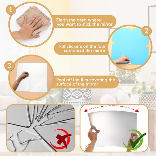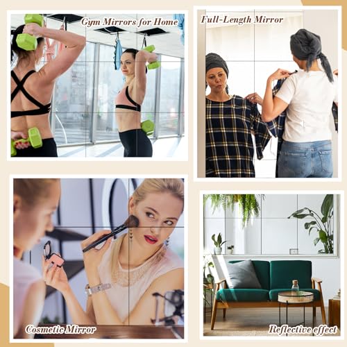 Nice Mirror Decorations: the mirror sheets are reflective, which are wonderful home mirrors decor, wall mounted mirror, bedroom ceiling mirrors, workout room mirrors, dance studio mirrors, window pane mirrors, garage mirror and so on; But even so, in order to give protection to the product from being scratched right through transportation, the surface has a protective film, please tear off it before use; Please use soft cloth and warm water to clean the mirror